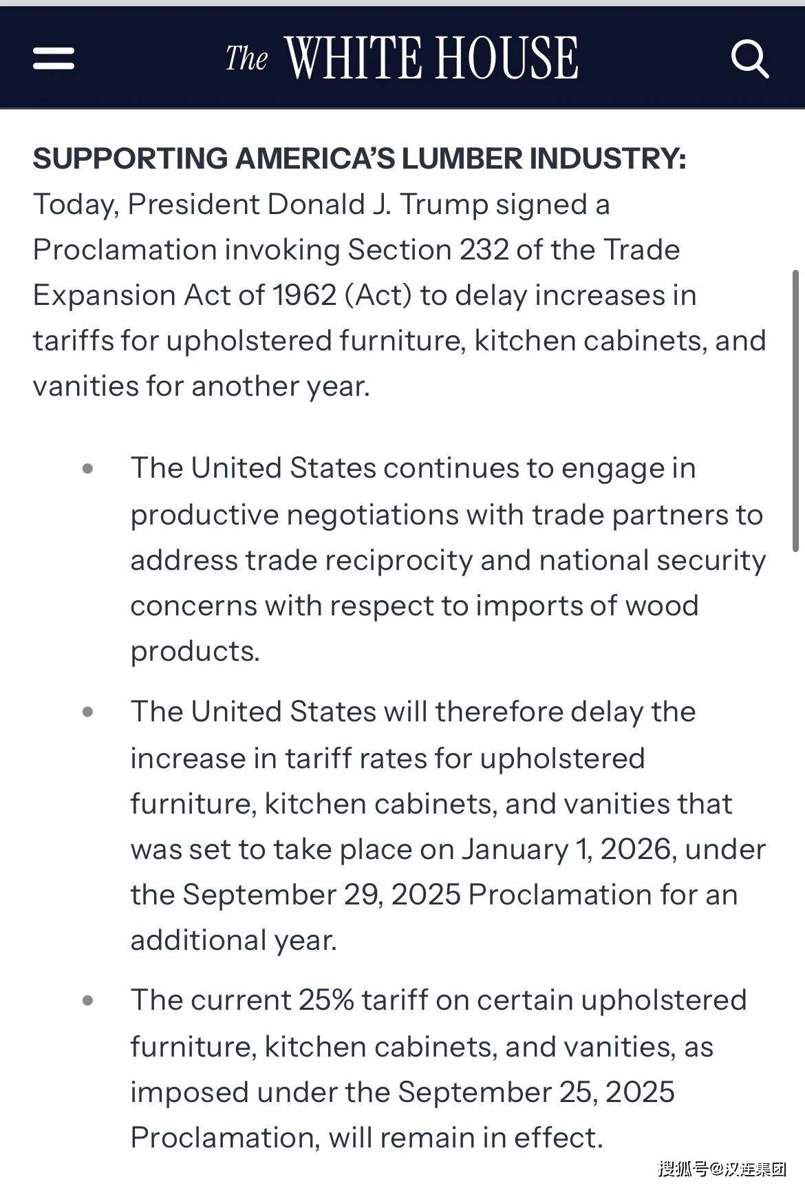 早正在2025年9月,特朗普便号令对厨房橱柜和软体家具加征25%的新合税,该手段于10月正式落地践诺。遵从原预备,到2026年,税率将进一步上调,个中厨房橱柜的合税将升至50%,软体家具的合税将升至30%。而周三宣告的号令推迟了此次大幅上调合税的策画,这意味着目前这些商品的合税仍临时保护正在25%的秤谌。
